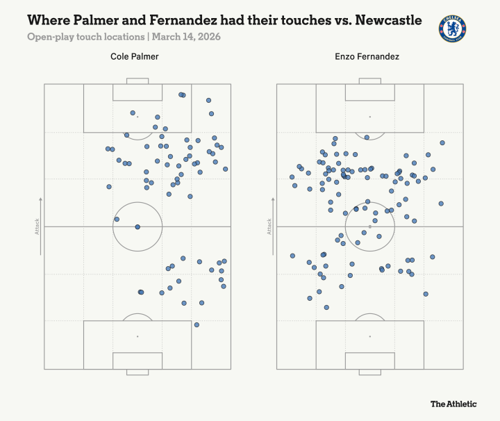 在帕尔默缺席的21场对抗赛中(与2025-26比联赛季两人共同出战的24场对抗赛相比),他在对方惩点球决胜区内内的触球次数和传送到攻击三区的次数几乎翻了一番。他创造的平均机会数从每90分钟1.6次增加到2.3次。他的踢门次数也更多(预期入球数值显著更高),射门命中次数翻了一番,而且转化率也更高。
