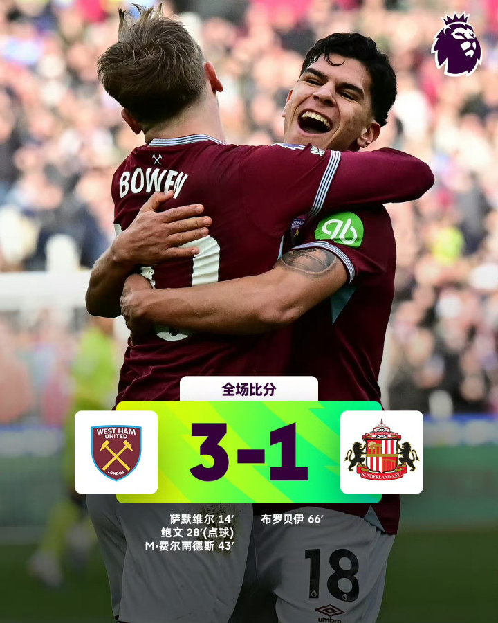 西汉姆联3-1桑德兰:世界波+十二码球,铁锤帮大胜