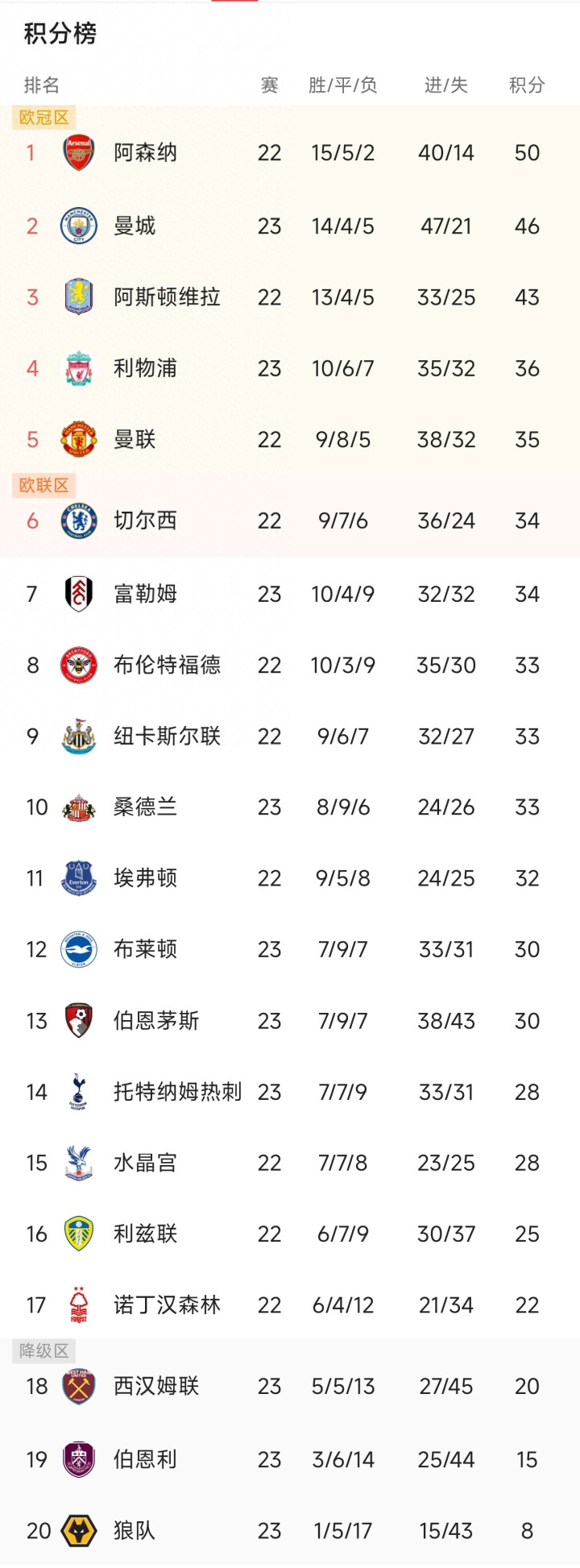 曼城凭借主场作战 2-0完胜狼队,以46分处于积分榜第二位,追赶 少赛一场的阿森纳4分;利物浦客场应战 2-3遭伯恩茅斯补时致胜球 ,积分停留在36分,与榜首差距拉大到14分;热刺2-2战平伯恩利后以28分排名第14。