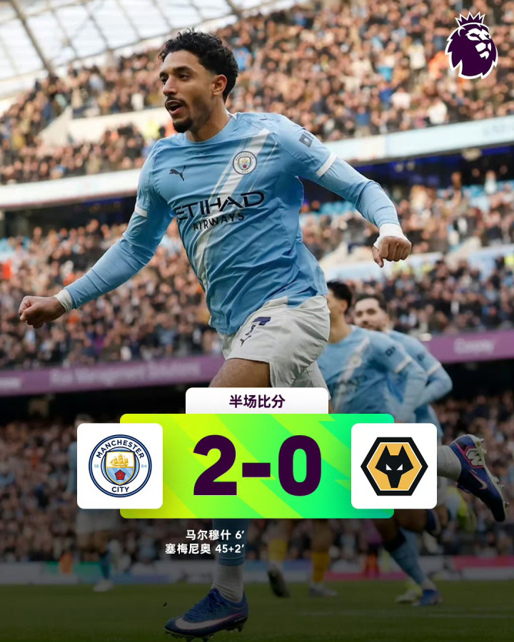 半场补时第2分钟,曼城扩大领跑 优势。塞梅尼奥在危险区域 内破门,将比分扩大到2-0。